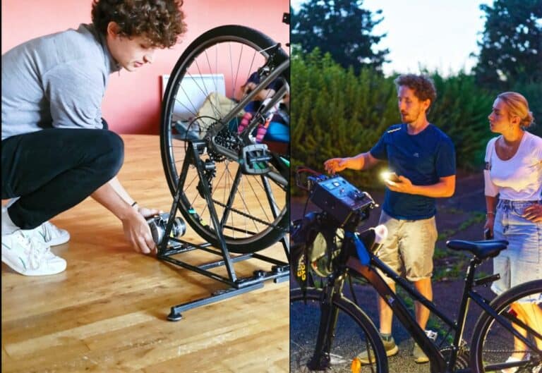 Notre dispositif permet d’organiser des séances de cinéma intégralement alimentées par l’énergie fournie par un.e cycliste. Il peut se déployer n’importe où et chaque spectateur·rice est invité·e à pédaler durant la séance pour produire l’énergie nécessaire à la projection. Cette technologie est adaptée aux impératifs de l’itinérance à vélo : légèreté, robustesse et adaptabilité. Le kit entier peut donc tenir sur un porte-bagage ou dans une remorque tractée.